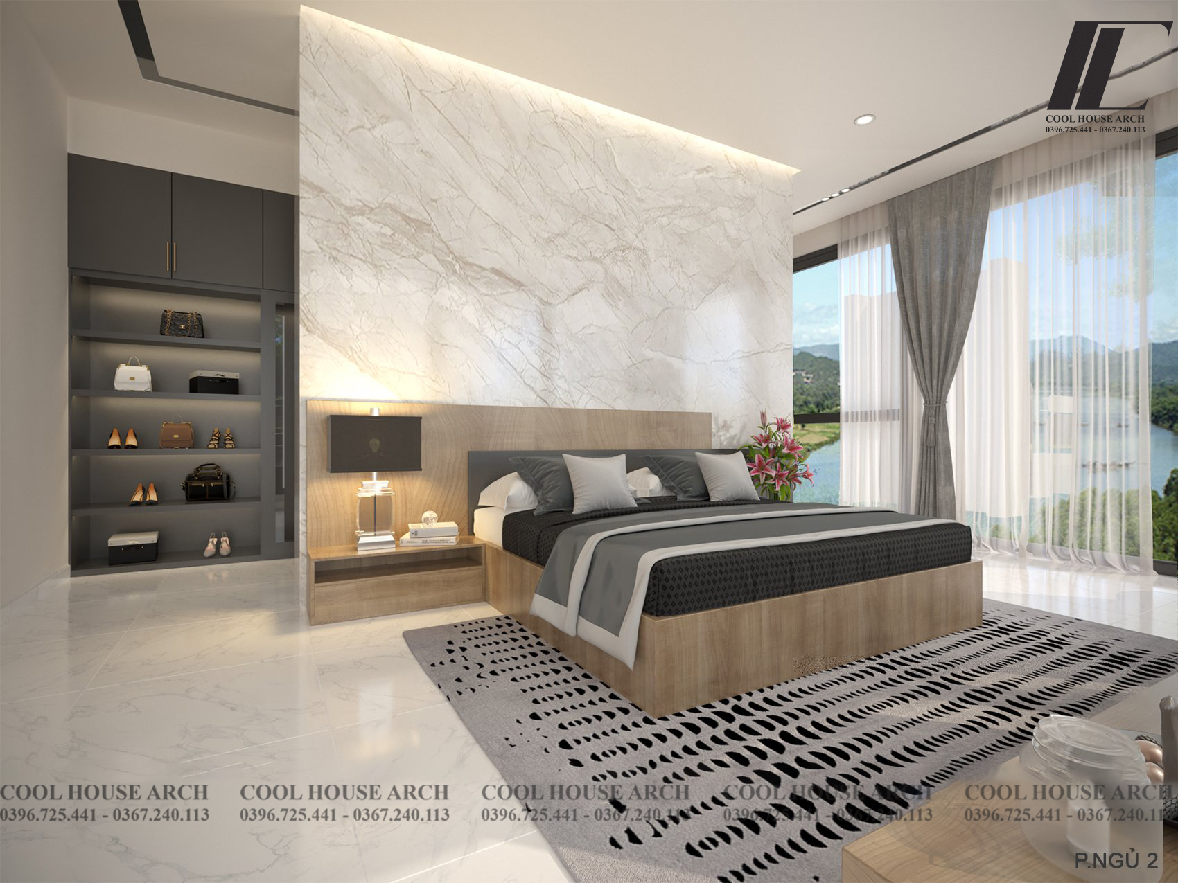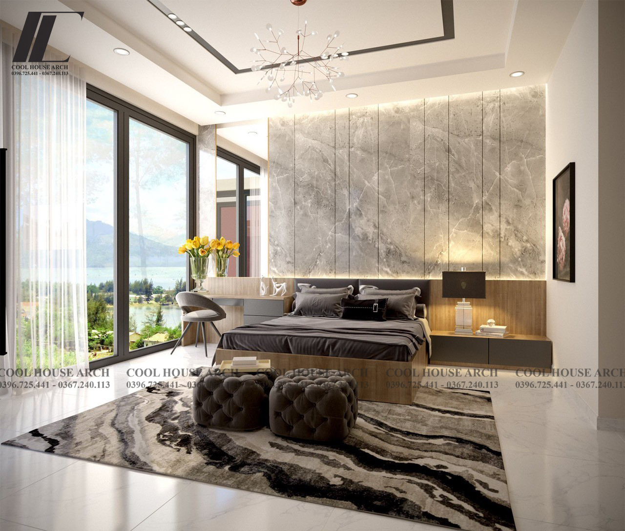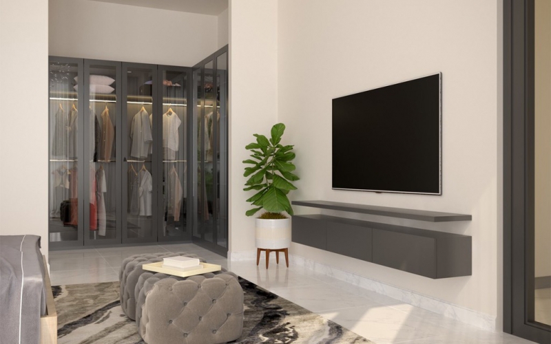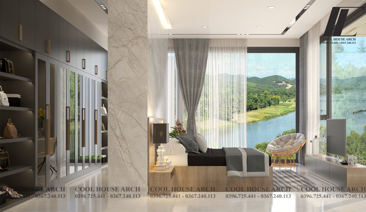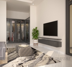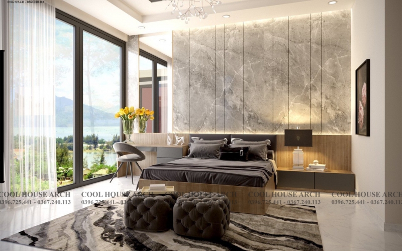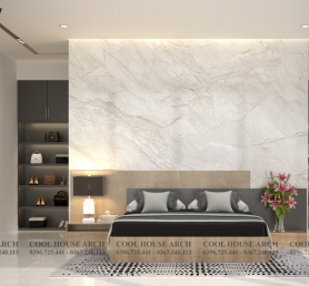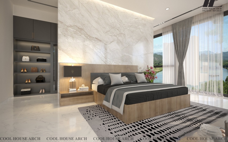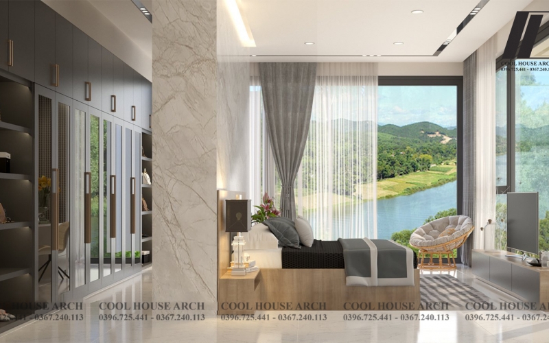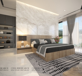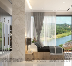 Không gian phòng ngủ master được thiết kế tối giản với tông màu trắng xám , hệ kính lớn mở ra không gian nhìn cảnh vật xung quanh, đón ánh sáng tự nhiên. Tất cả mang đến cảm giác thư thái và bình yên cho gia chủ sau một ngày dài.