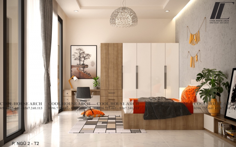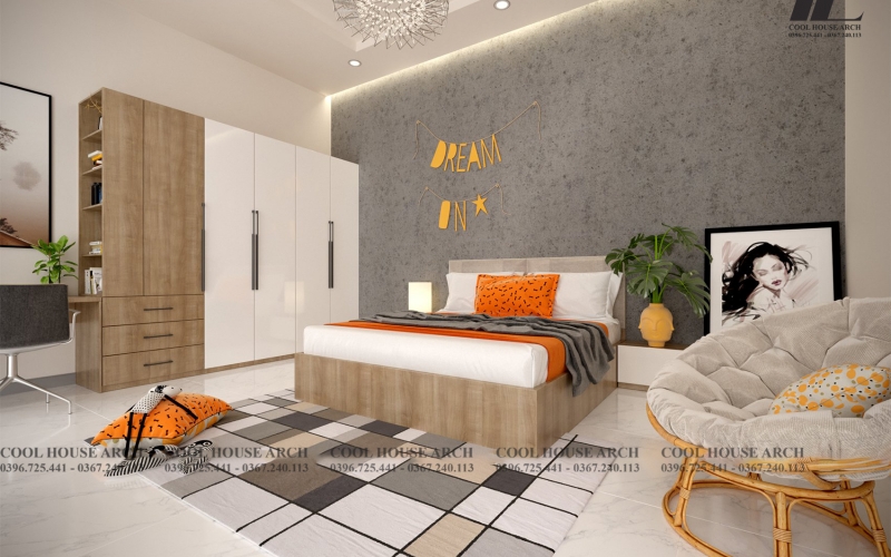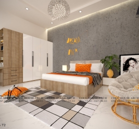 Phòng master mang phong cách hiện đại, kết hợp với cửa kính lớn mở ra ban công, đón nắng và gió tự nhiên mỗi sáng. Hai phòng ngủ của con được bố trí gần nhau, đảm bảo tiện nghi, ánh sáng và sự riêng tư. Khu giặt phơi được sắp xếp phía sau nhà, vừa kín đáo vừa thuận tiện cho sinh hoạt gia đình.
