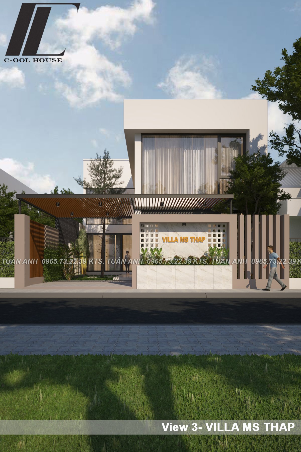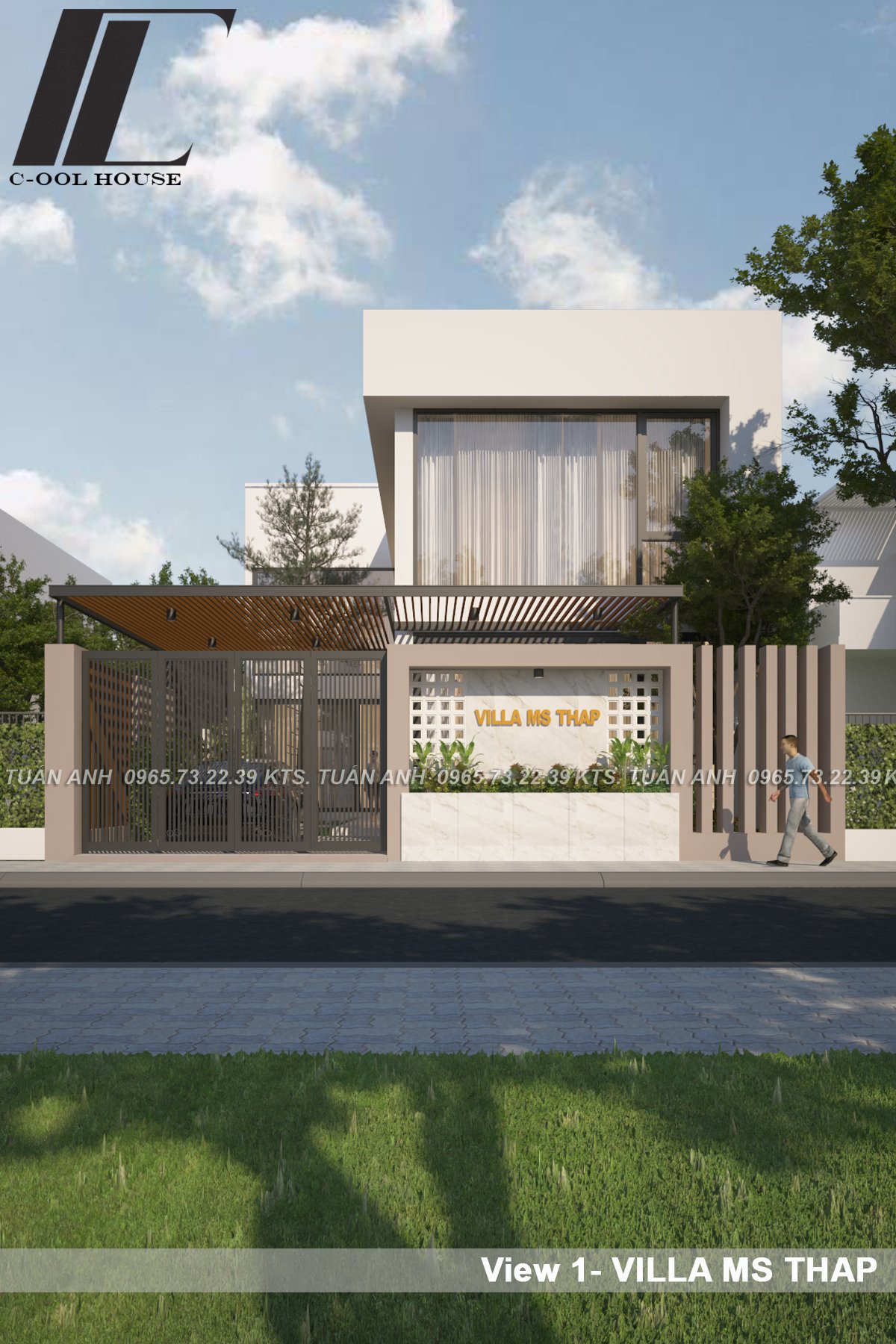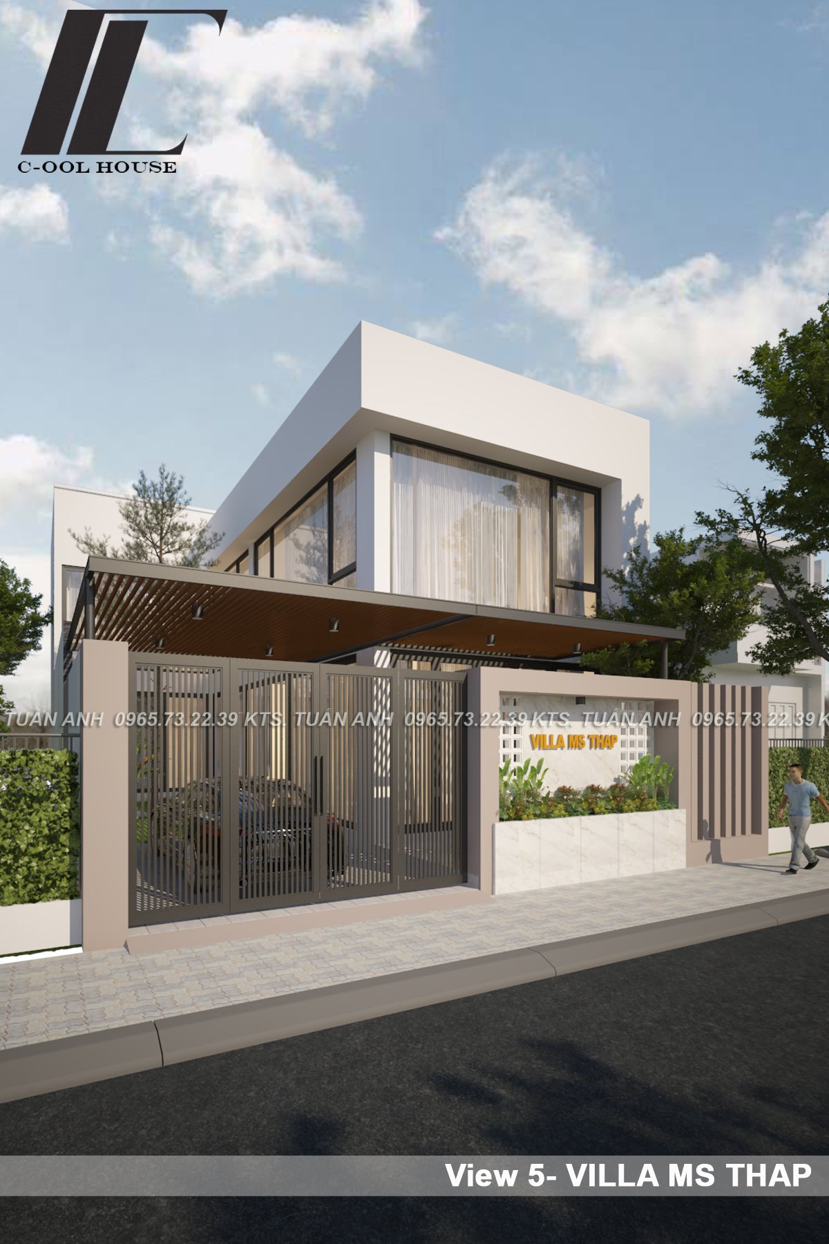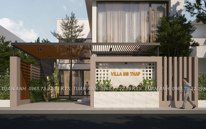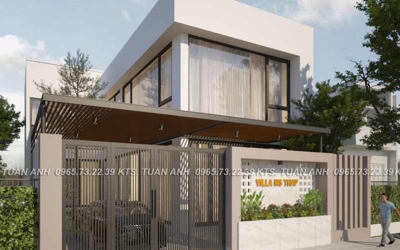 Biệt thự hiện đại của chị Thập được hình thành từ triết lý “Sống tối giản – hưởng thụ tinh tế”. Gia chủ mong muốn có một ngôi nhà thông thoáng, tràn ngập ánh sáng tự nhiên và có nét riêng biệt. Đội ngũ kiến trúc sư Cool House đã lựa chọn phong cách hiện đại tối giản, sử dụng khối hình học vuông vức, gam màu trắng chủ đạo kết hợp cùng gam màu xám làm điểm nhấn tạo ra sự tối giản cho không gian. Hệ cửa kính lớn được bố trí hợp lý giúp căn biệt thự đón gió, lấy sáng và mở rộng tầm nhìn ra không gian xung quanh căn nhà.