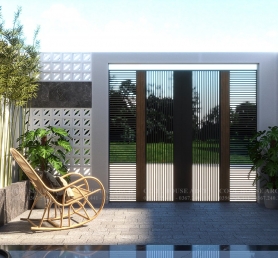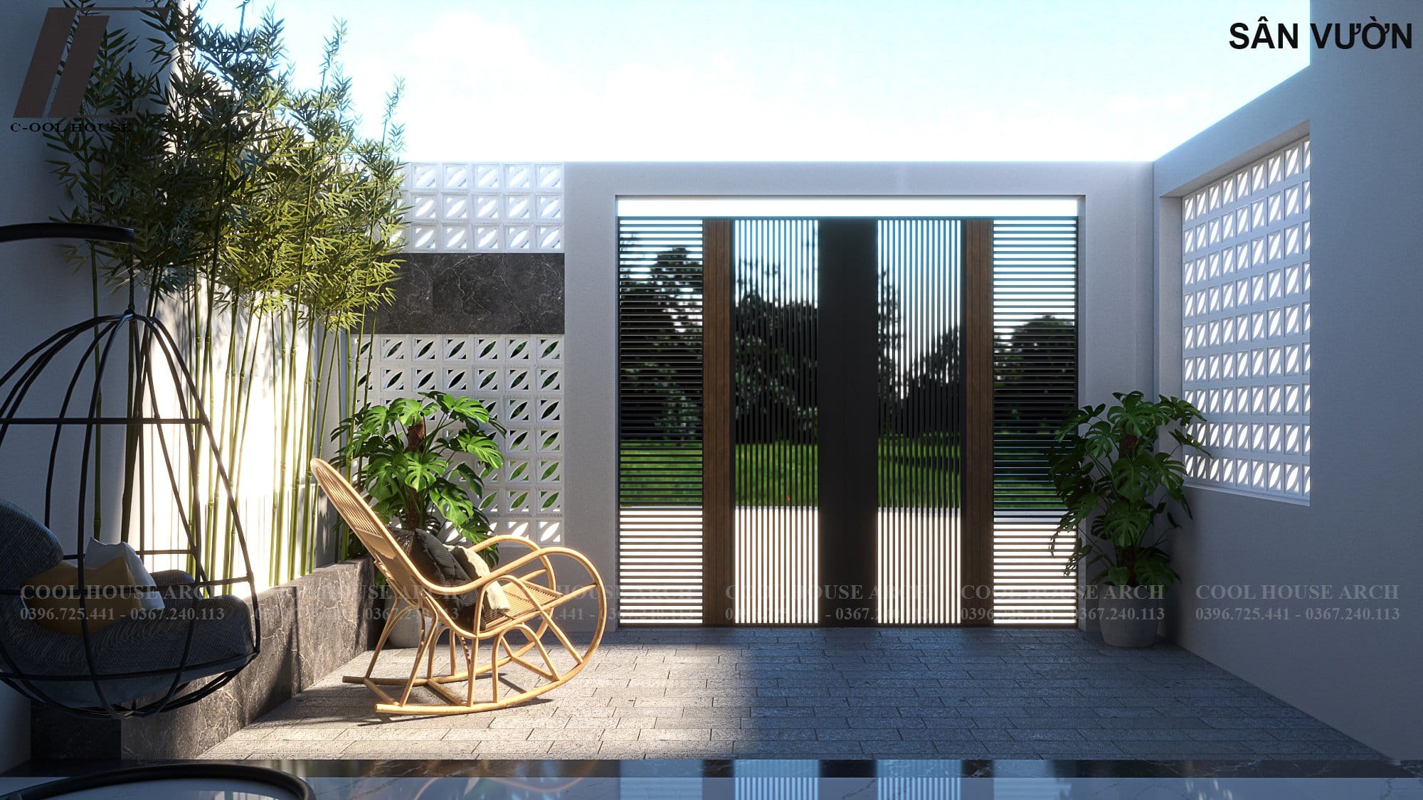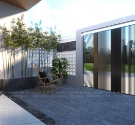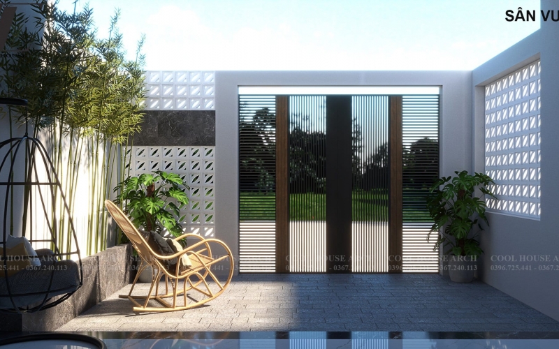 Bước qua cánh cổng là một khoảng sân vườn nhỏ, nơi ánh sáng len lỏi qua tường gạch thông gió, tạo nên không gian yên bình. Một chiếc ghế mây, vài chậu cây, đủ để gia chủ tận hưởng buổi sáng nhẹ nhàng hay chiều muộn thư giãn.