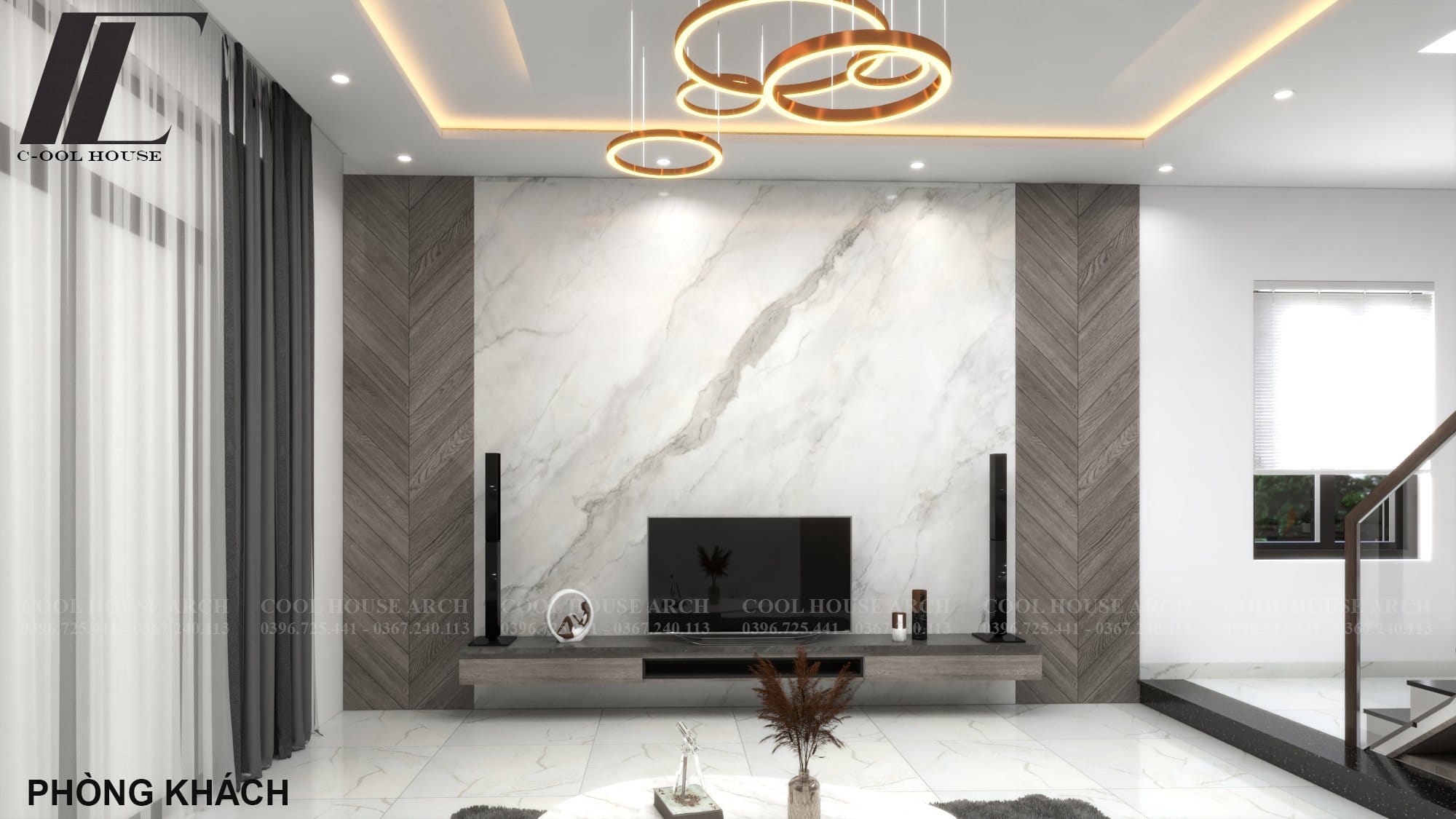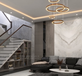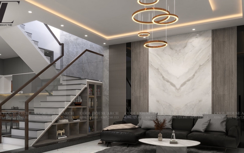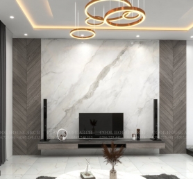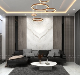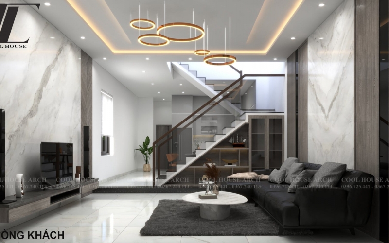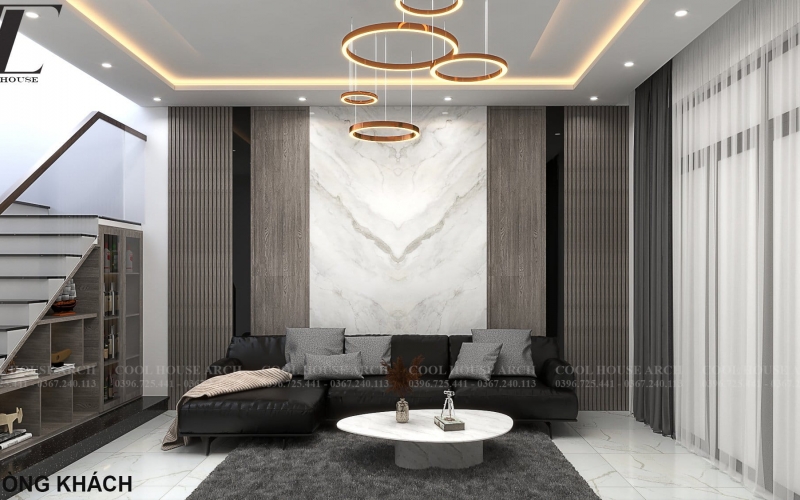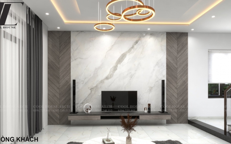 Phòng khách rộng rãi với trần đèn trang trí và tường ốp đá marble sang trọng.