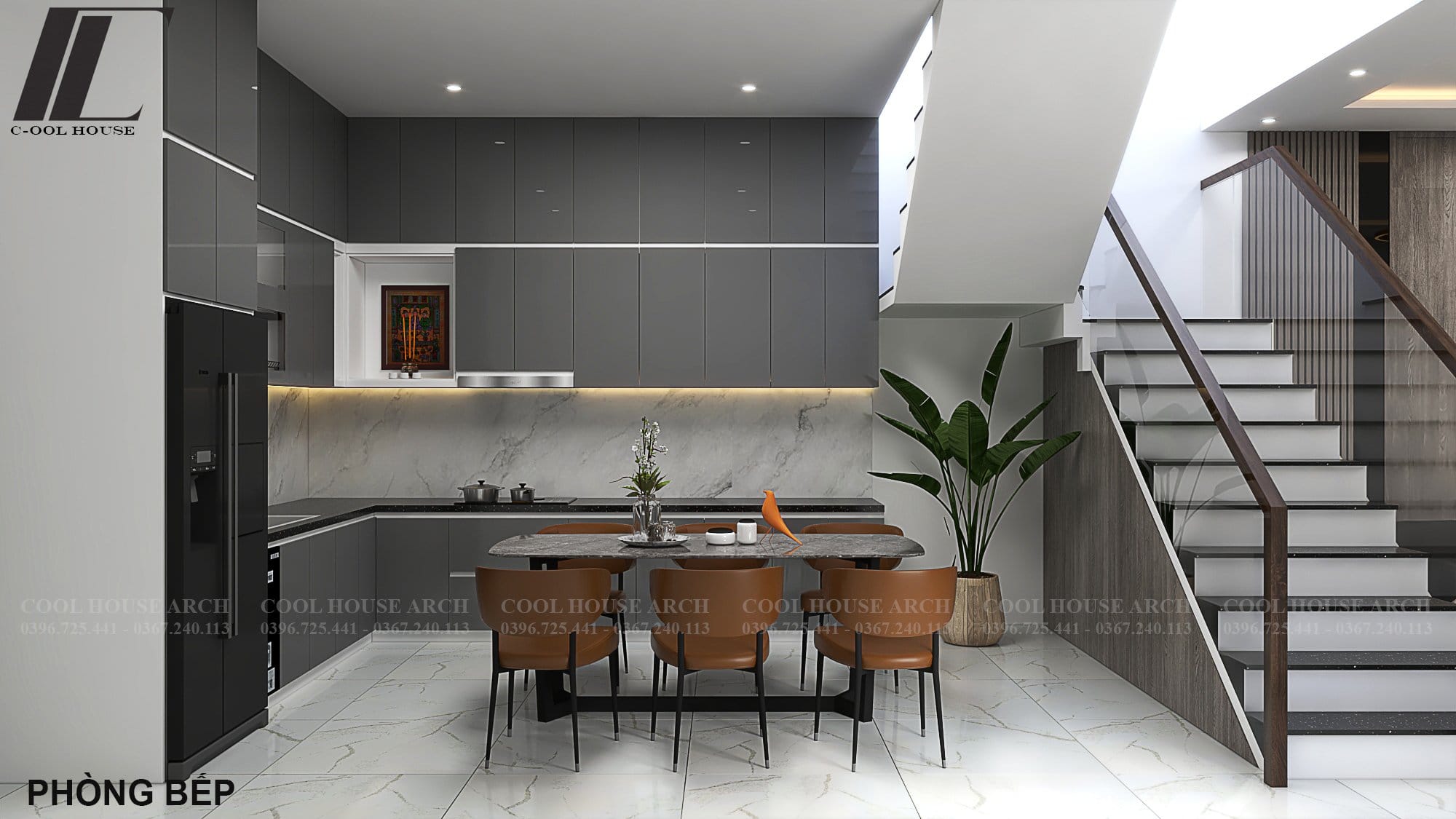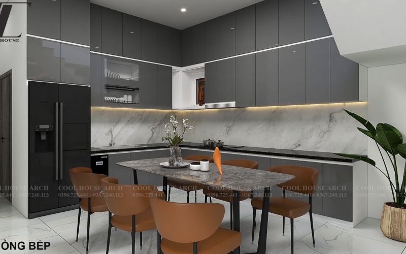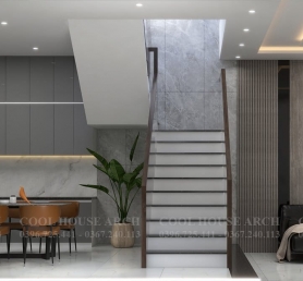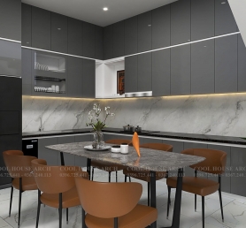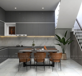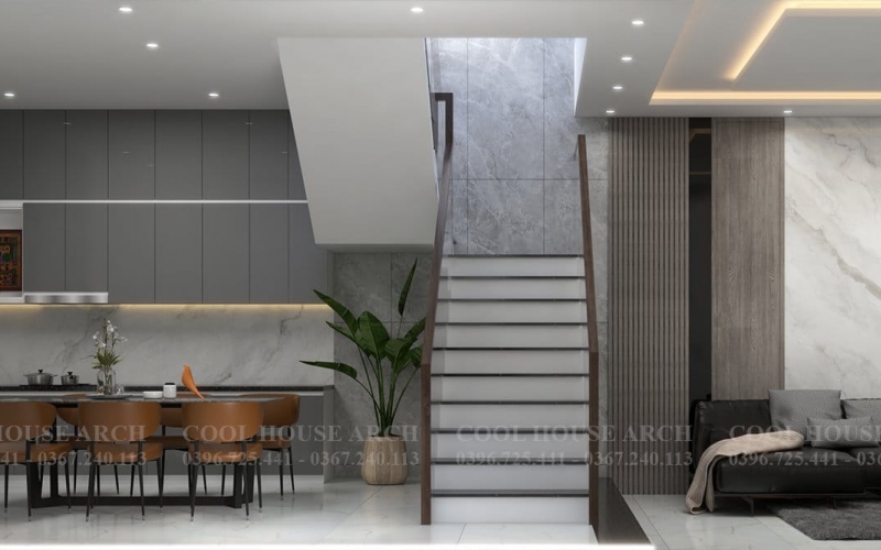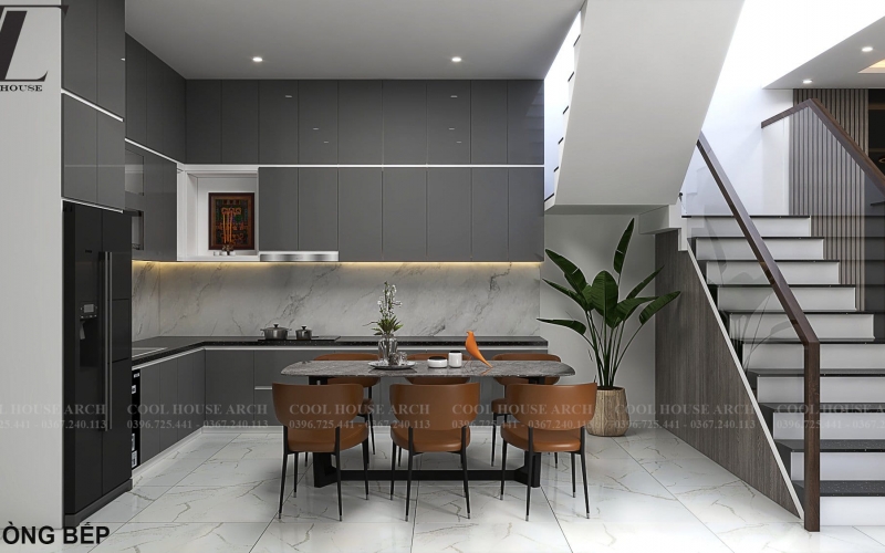 Khu bếp – ăn được bố trí gọn gàng, sử dụng gam màu xám kết hợp ánh sáng tự nhiên từ cầu thang, tạo nên không gian ấm cúng, là nơi gắn kết các thành viên trong bữa cơm gia đình.