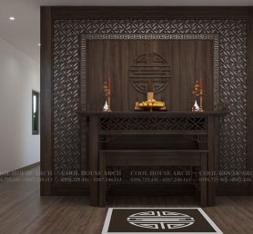 Phòng thờ gỗ nâu trầm, thiết kế trang trọng và mang đậm nét Á Đông.
