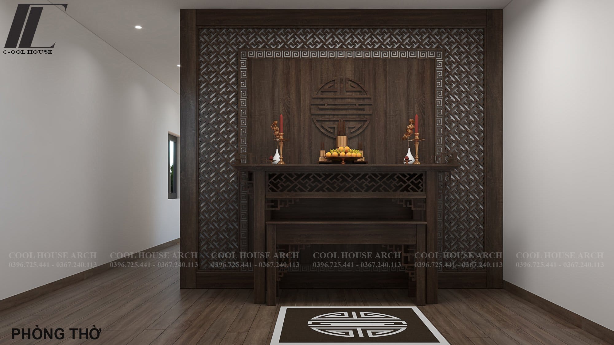 Giữa nét hiện đại của tổng thể, phòng thờ vẫn giữ được sự tôn nghiêm, ấm cúng với chất liệu gỗ nâu trầm, hoa văn truyền thống tinh tế. Đây là nơi con cháu tưởng nhớ cội nguồn và duy trì giá trị văn hóa Việt.