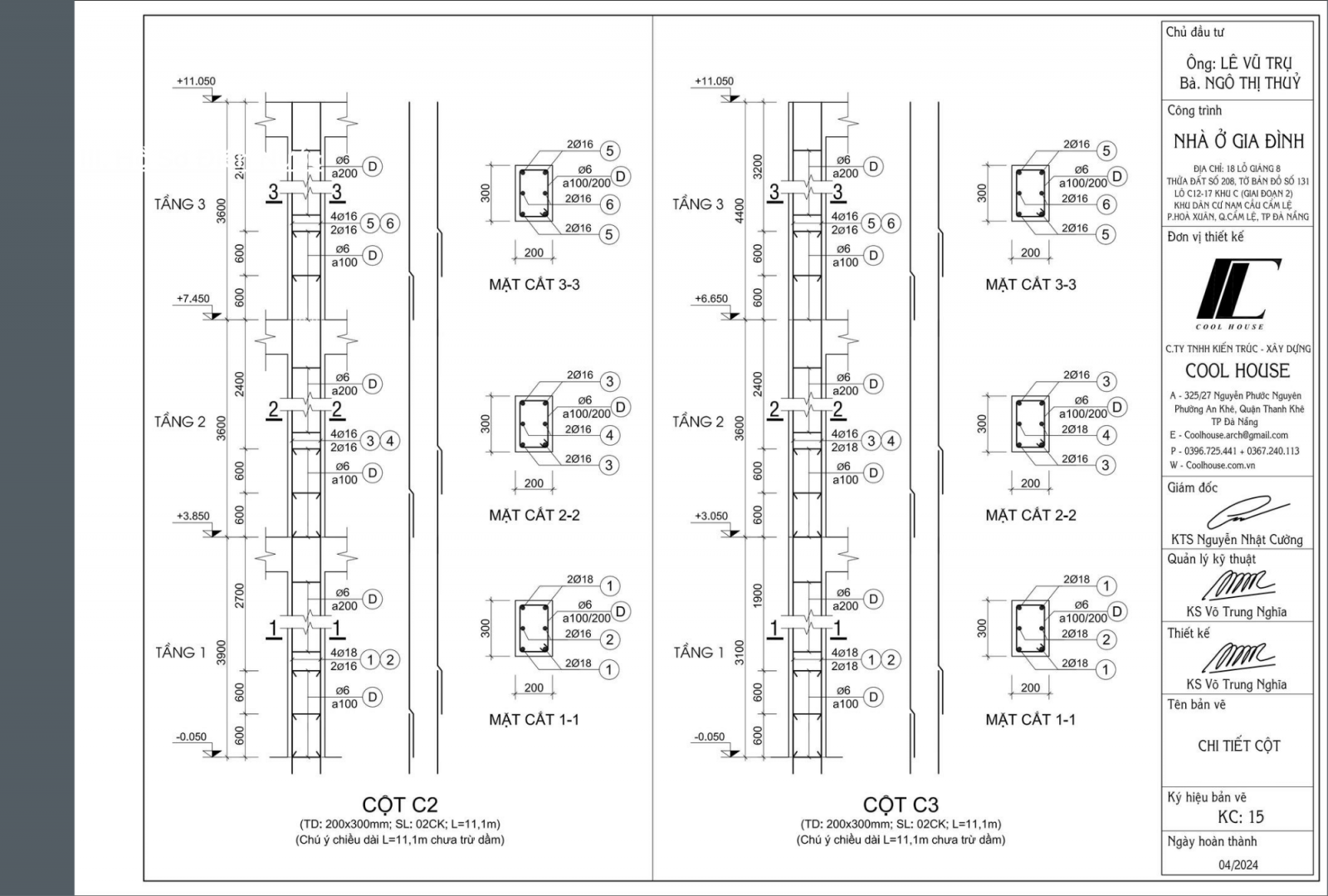🔹Chi tiết cột: mặt cắt dọc và mặt cắt ngang, thẻ hiện đầy đủ số lượng, đường kính thép, thể hiện khoảng cách và vị trí nối thép...