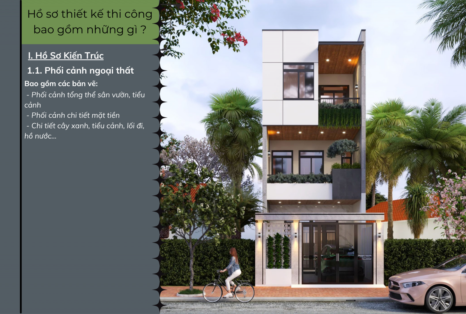 Phối cảnh ngoại thất: 3-7 view tổng thể mặt tiền, các góc nhìn chính diện, nhìn xiên, góc nhìn mái, cảnh quan sân vườn, chi tiết tiểu cảnh, cổng ngõ tường rào...