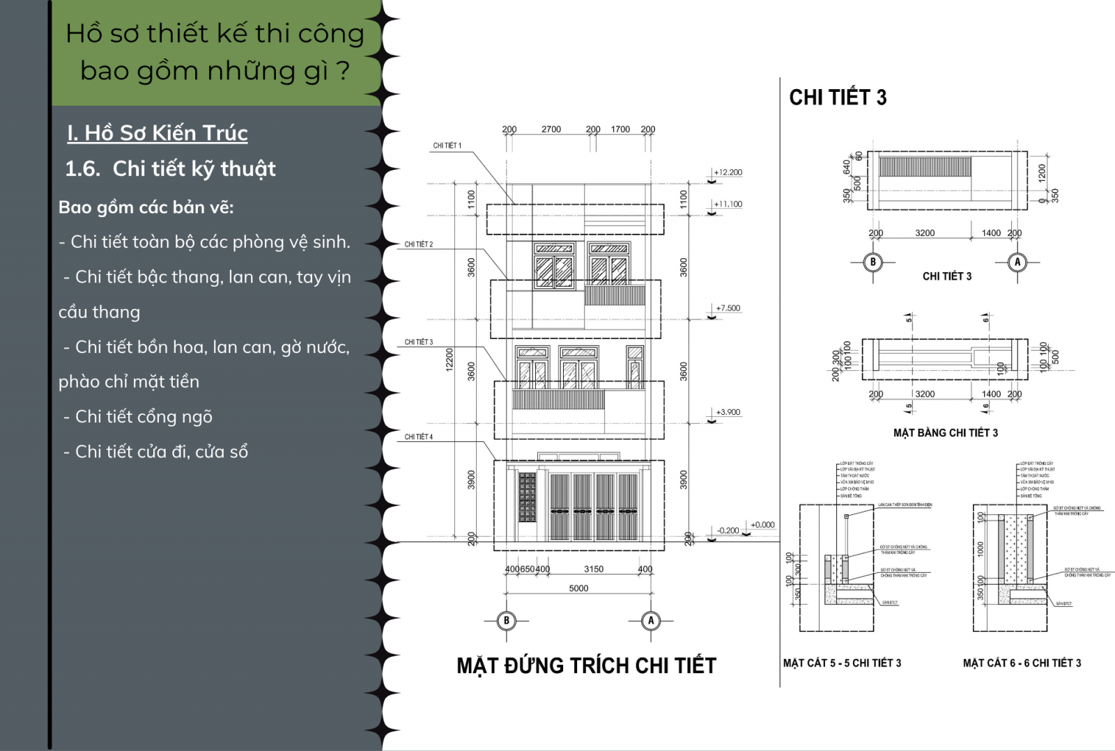 Bản vẽ chi tiết kỹ thuật: Đây là các bản vẽ chi tiết quan trọng để hoàn thành ngôi nhà theo mong muốn ban đầu của gia chủ, bao gồm các chi tiết hoàn thiện và chi tiết kỹ thuật
