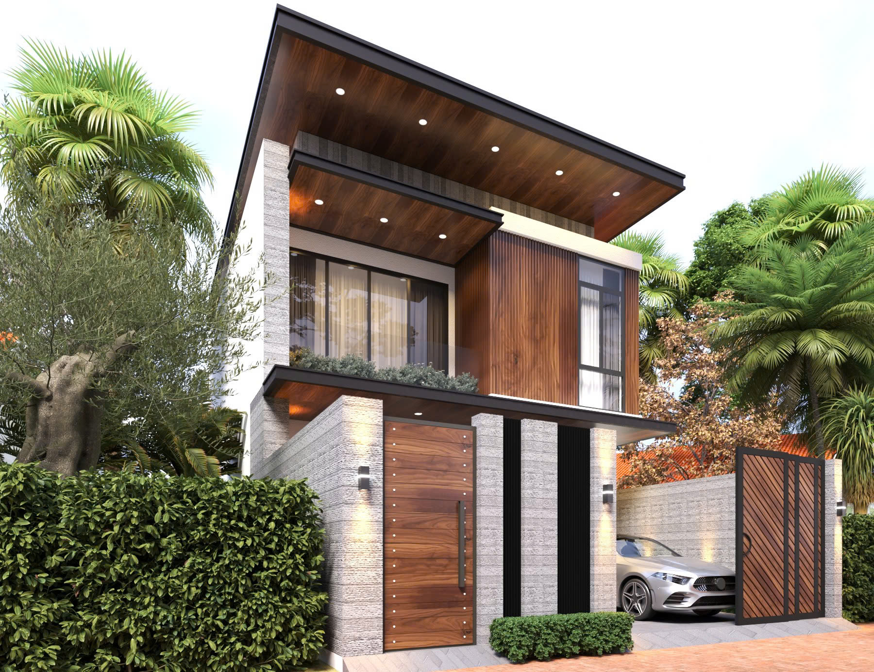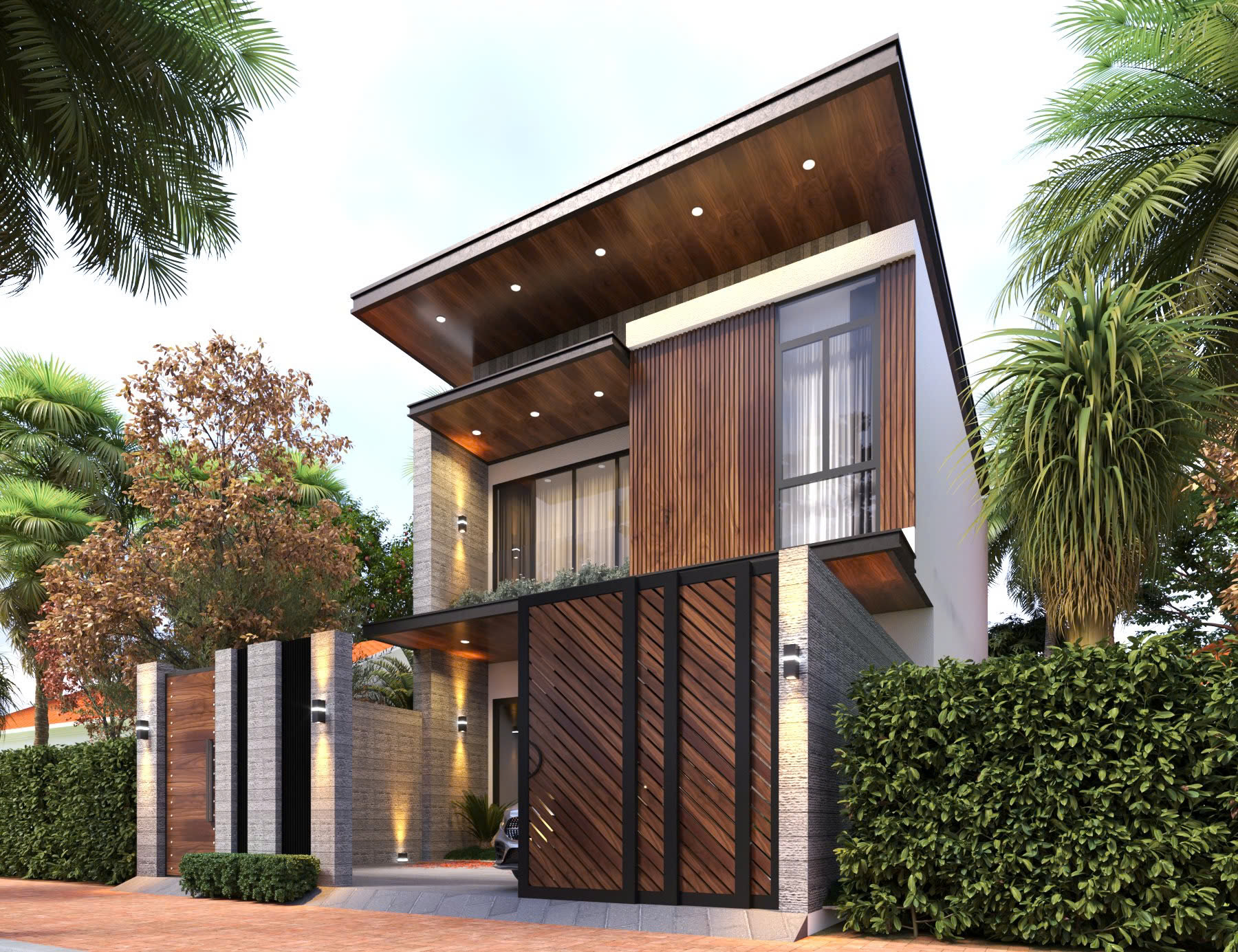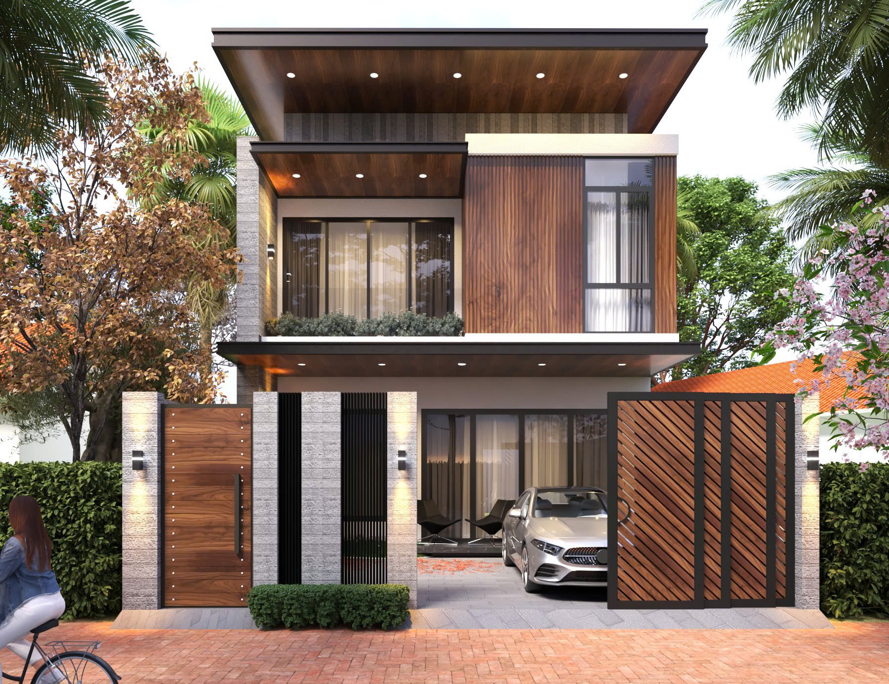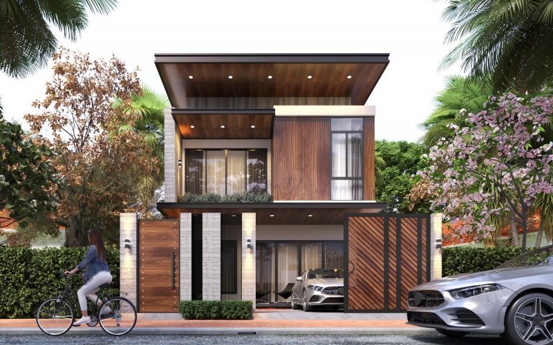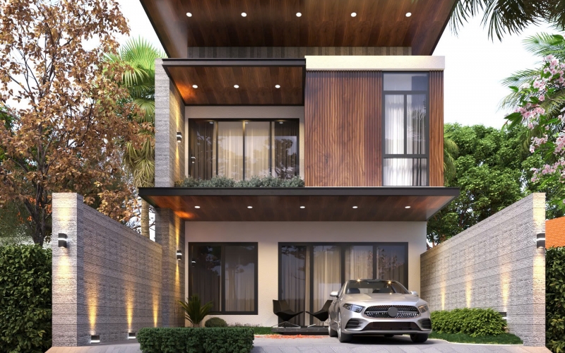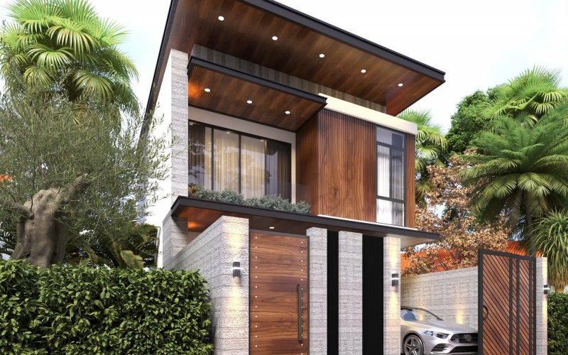 Mặt tiền được bố trí theo bố cục đối xứng, sử dụng mảng tường ốp đá tự nhiên kết hợp lam gỗ đứng để tạo điểm nhấn. Cổng nhà bằng gỗ ốp chéo khung sắt sơn đen tĩnh điện không chỉ đảm bảo an ninh mà còn nâng tầm thẩm mỹ tổng thể.