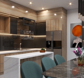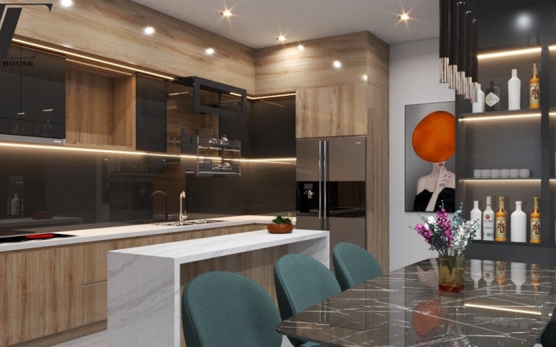 Không gian bếp được bố trí liền kề bàn ăn, tạo sự tiện lợi và gắn kết. Gam màu gỗ vàng be cùng ánh đèn vàng dịu mang lại cảm giác ấm cúng – nơi những bữa cơm sum vầy trở thành khoảnh khắc quý giá.
