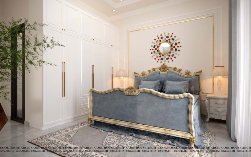 Chiếc giường chạm khắc tinh xảo cùng hệ tủ âm tường trắng tạo nên cảm giác hoàng gia nhẹ nhàng, không phô trương. Ánh sáng vàng dịu từ đèn ngủ lan tỏa trên nền vải mềm, mang đến sự thư thái sau một ngày làm việc mệt mỏi.