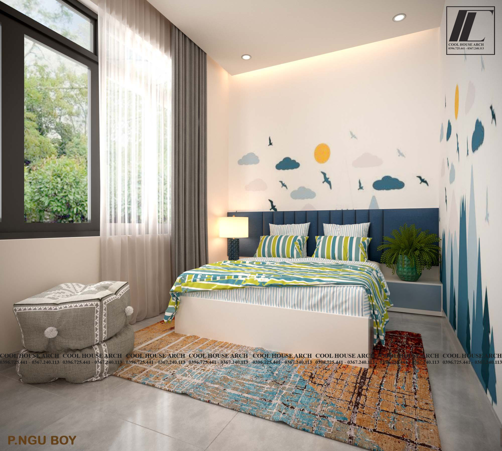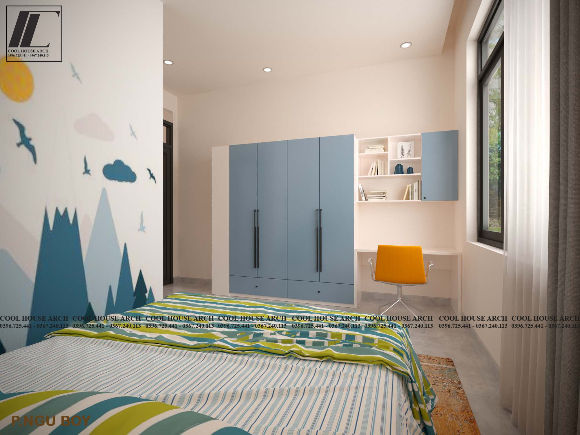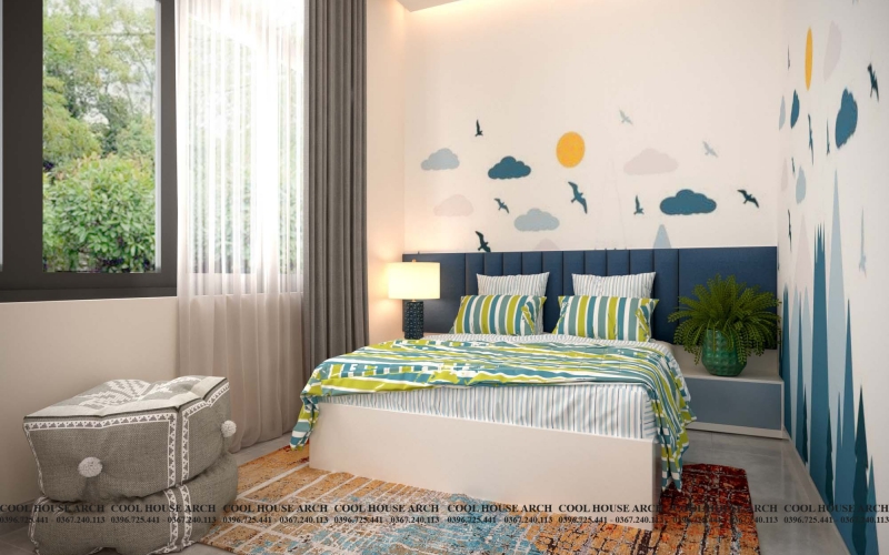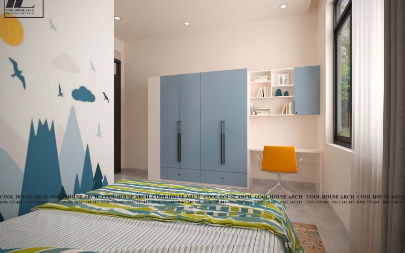Phòng ngủ dành cho con trai trong gia đình được thiết kế thông thoáng với ô cửa sổ lớn và theo sở thích cá tính riêng của con với gam màu xanh nhẹ dịu tạo cảm giác thoải mái khi bước vào phòng.