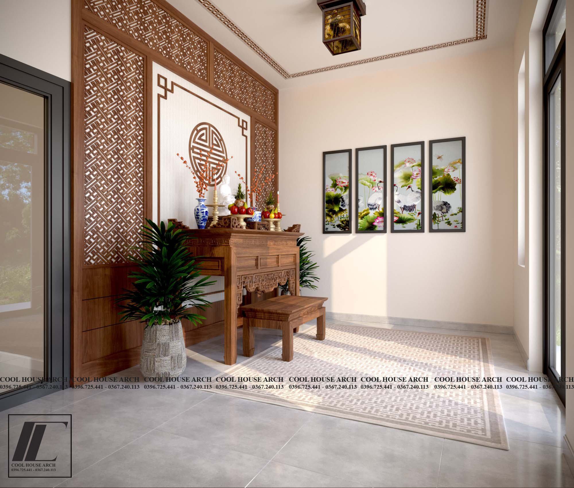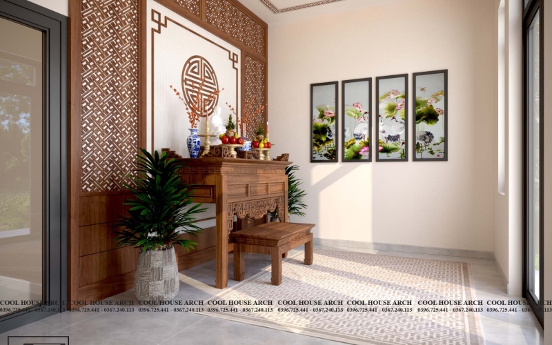 Phòng thờ được bố trí ở vị trí cao nhất của ngôi nhà – không gian linh thiêng, hướng ra khoảng sân rộng để đón ánh sáng tự nhiên. Cool House sử dụng gỗ nâu ấm và hoa văn truyền thống, tạo cảm giác tôn nghiêm mà vẫn gần gũi.