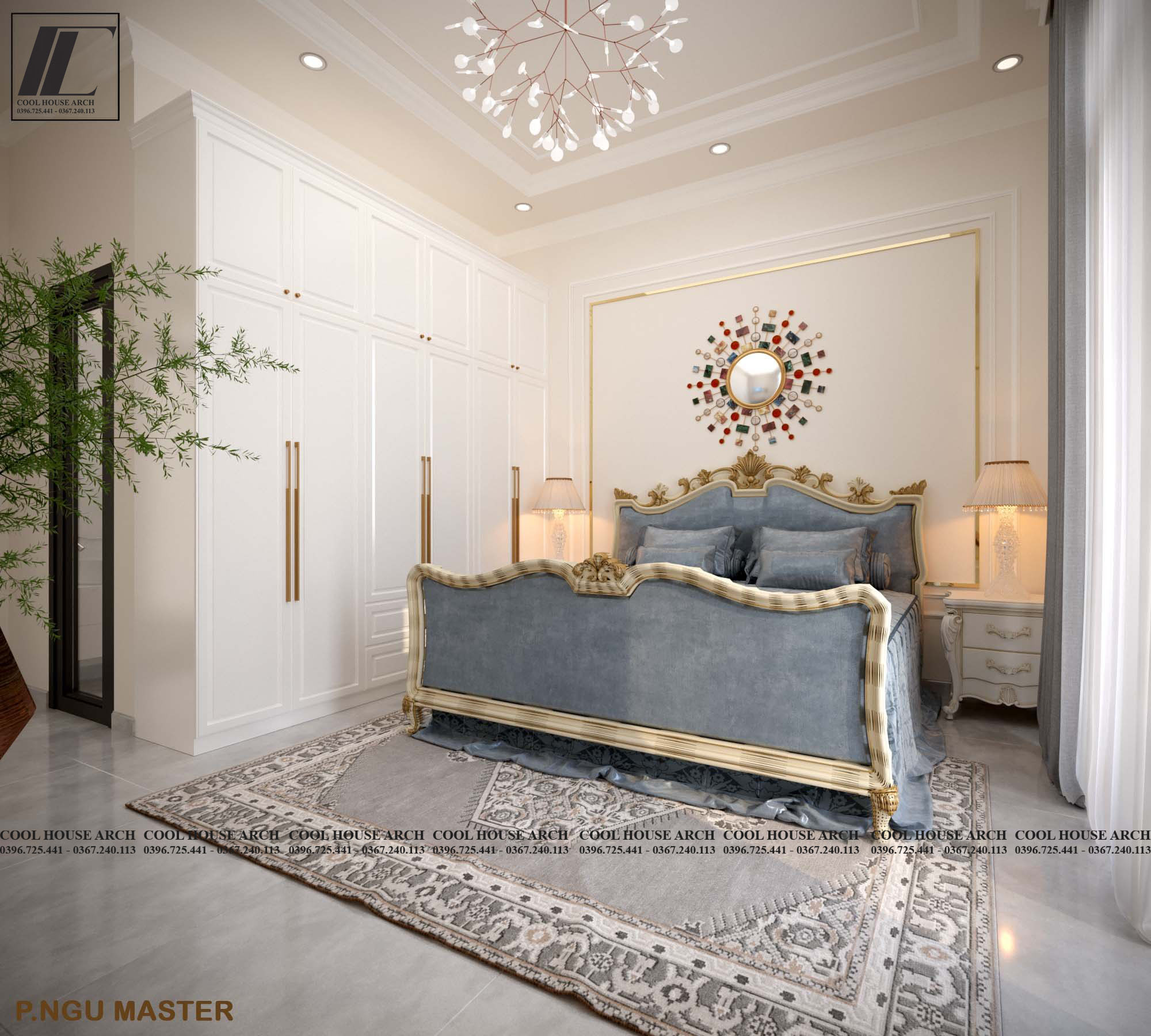 Phòng ngủ master dành cho vợ chồng chị Thương được thiết kế theo phong cách tân cổ điển nhẹ, với gam màu kem – xanh pastel thanh lịch.