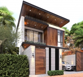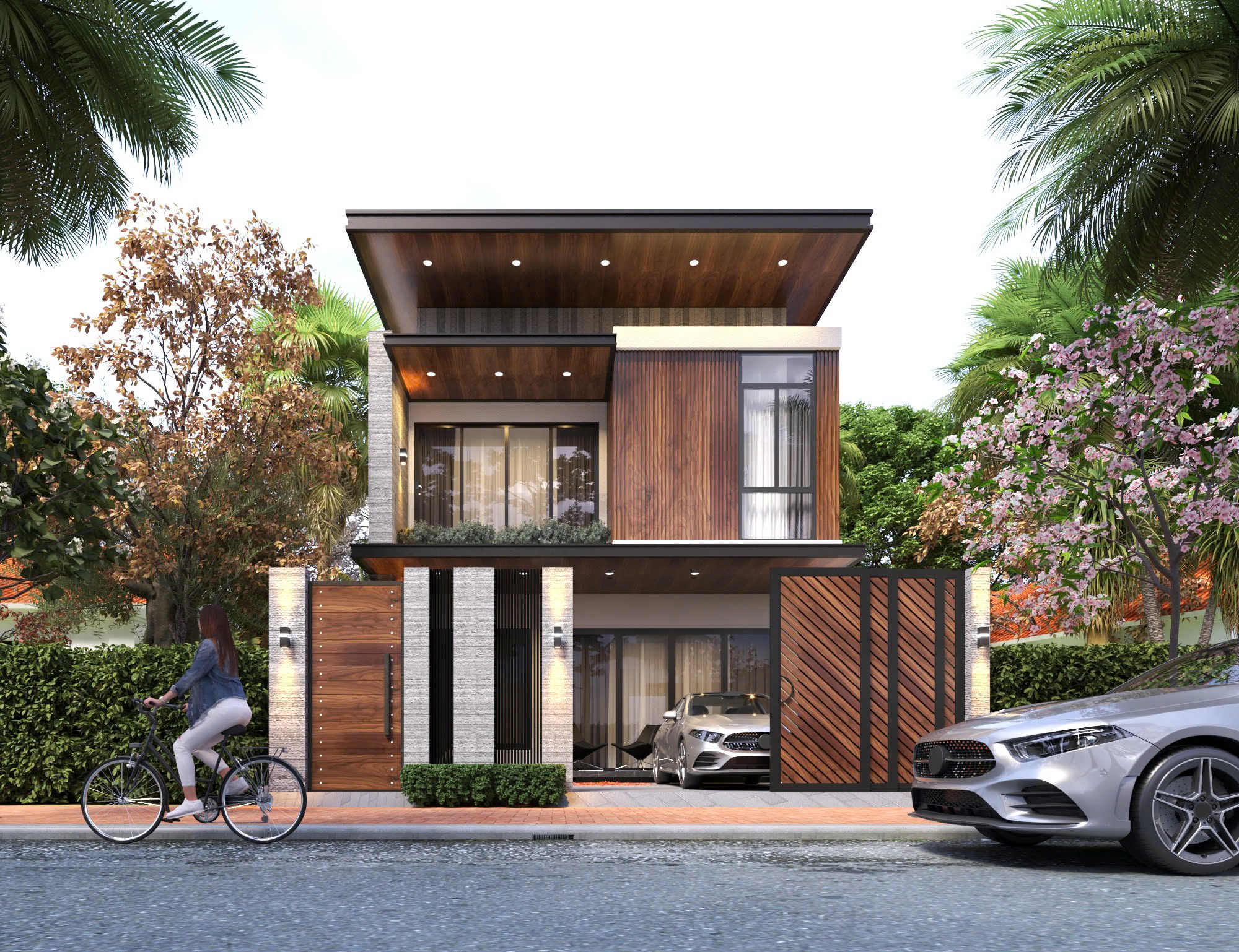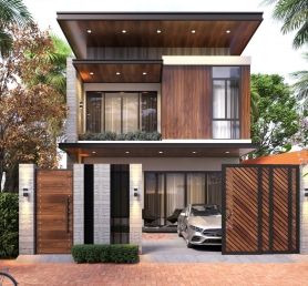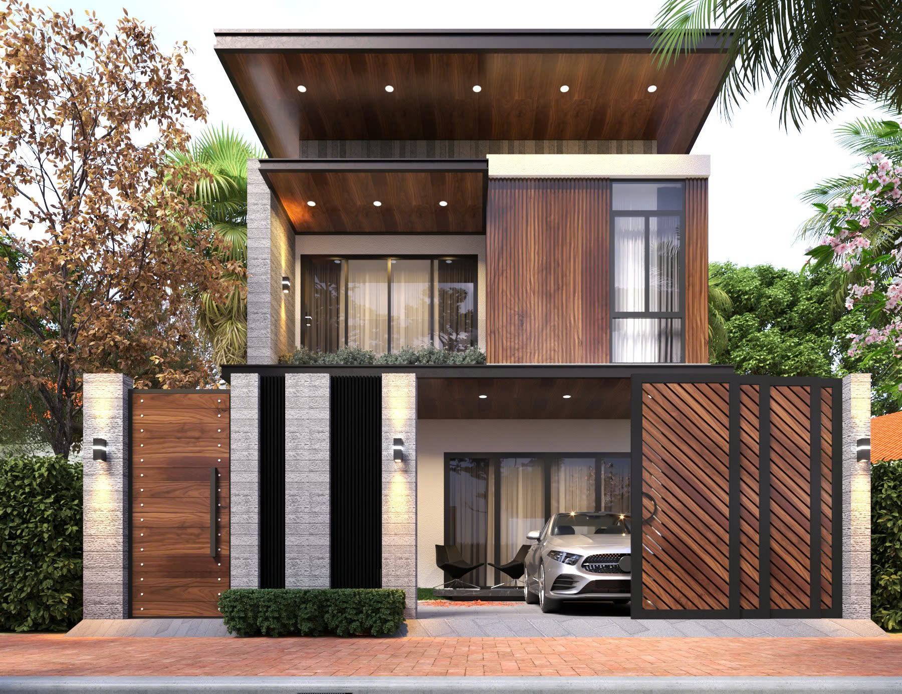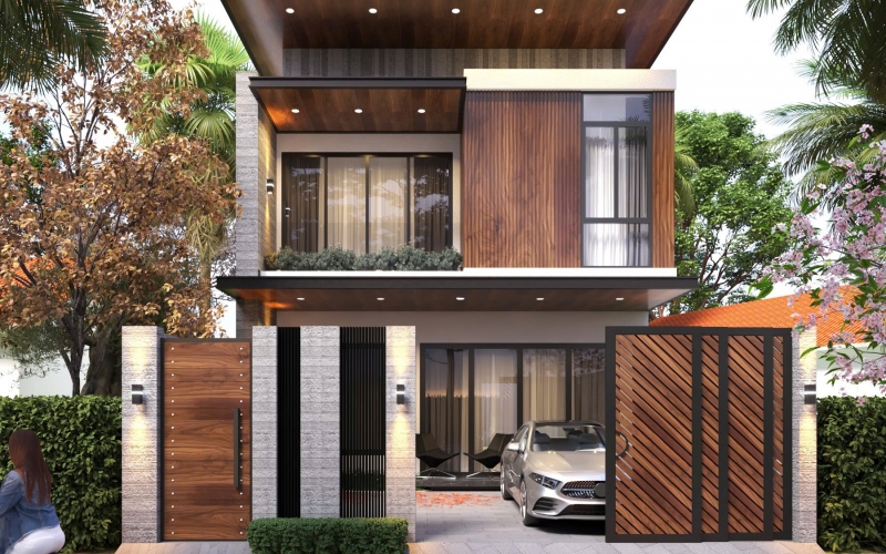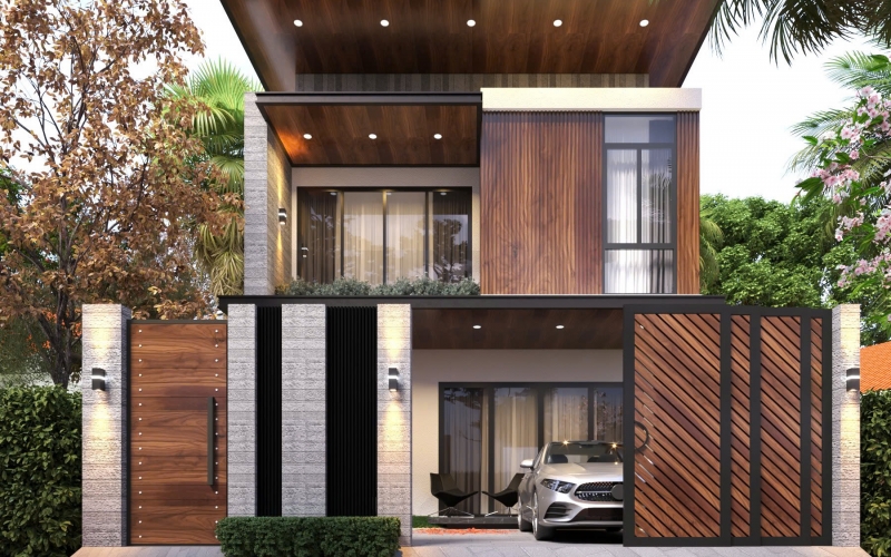 Mặt tiền được bố trí theo bố cục đối xứng, sử dụng mảng tường ốp đá tự nhiên kết hợp lam gỗ đứng để tạo điểm nhấn. Cổng nhà bằng gỗ ốp chéo khung sắt sơn đen tĩnh điện không chỉ đảm bảo an ninh mà còn nâng tầm thẩm mỹ tổng thể.