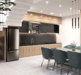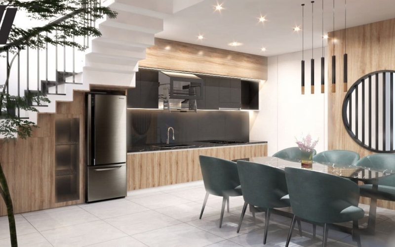 Không gian bếp được bố trí liền kề bàn ăn, tạo sự tiện lợi và gắn kết. Gam màu gỗ vàng be cùng ánh đèn vàng dịu mang lại cảm giác ấm cúng – nơi những bữa cơm sum vầy trở thành khoảnh khắc quý giá.