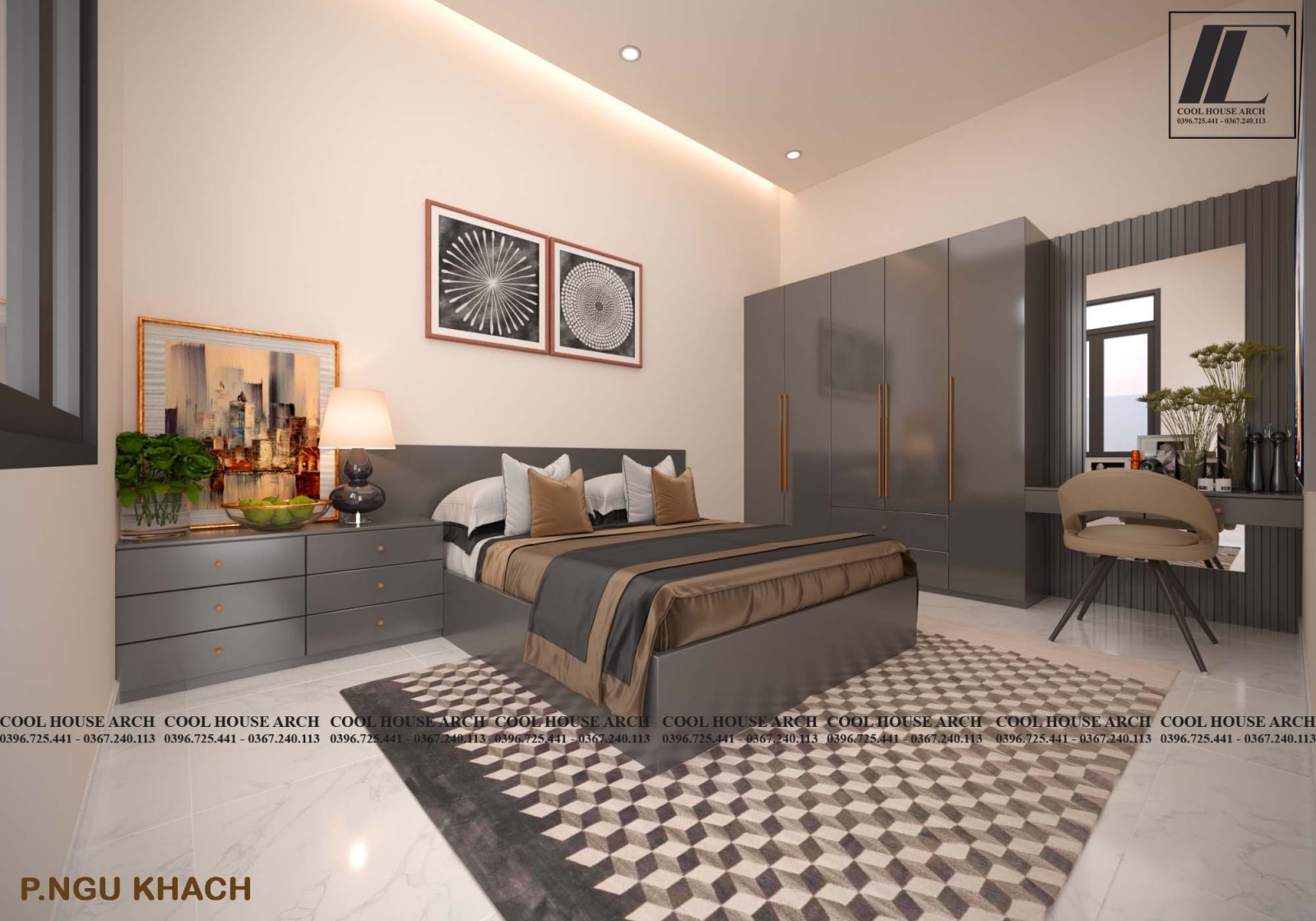 Phòng ngủ dành cho khách được thiết kế tối giản hiện đại với gam màu xám tạo sự sang trọng với đầy đủ tiện nghi