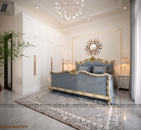 Chiếc giường chạm khắc tinh xảo cùng hệ tủ âm tường trắng tạo nên cảm giác hoàng gia nhẹ nhàng, không phô trương. Ánh sáng vàng dịu từ đèn ngủ lan tỏa trên nền vải mềm, mang đến sự thư thái sau một ngày làm việc mệt mỏi.
