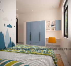 Phòng ngủ dành cho con trai trong gia đình được thiết kế thông thoáng với ô cửa sổ lớn và theo sở thích cá tính riêng của con với gam màu xanh nhẹ dịu tạo cảm giác thoải mái khi bước vào phòng.
