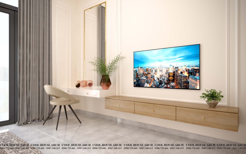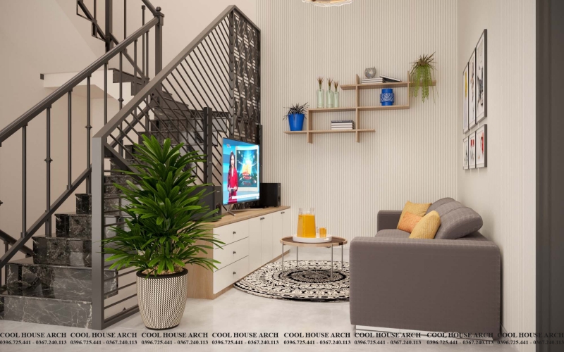 Phòng sinh hoạt chung được đặt ở trung tâm tầng 2 – không gian kết nối mọi thành viên. Một bộ sofa nhỏ, tivi và vài kệ gỗ treo tường – đơn giản nhưng ấm áp. Cool House chú trọng tạo ra cảm giác “gần gũi”, để dù chỉ là vài phút ngắn ngủi trong ngày, mọi người vẫn có thể cùng ngồi lại bên nhau.