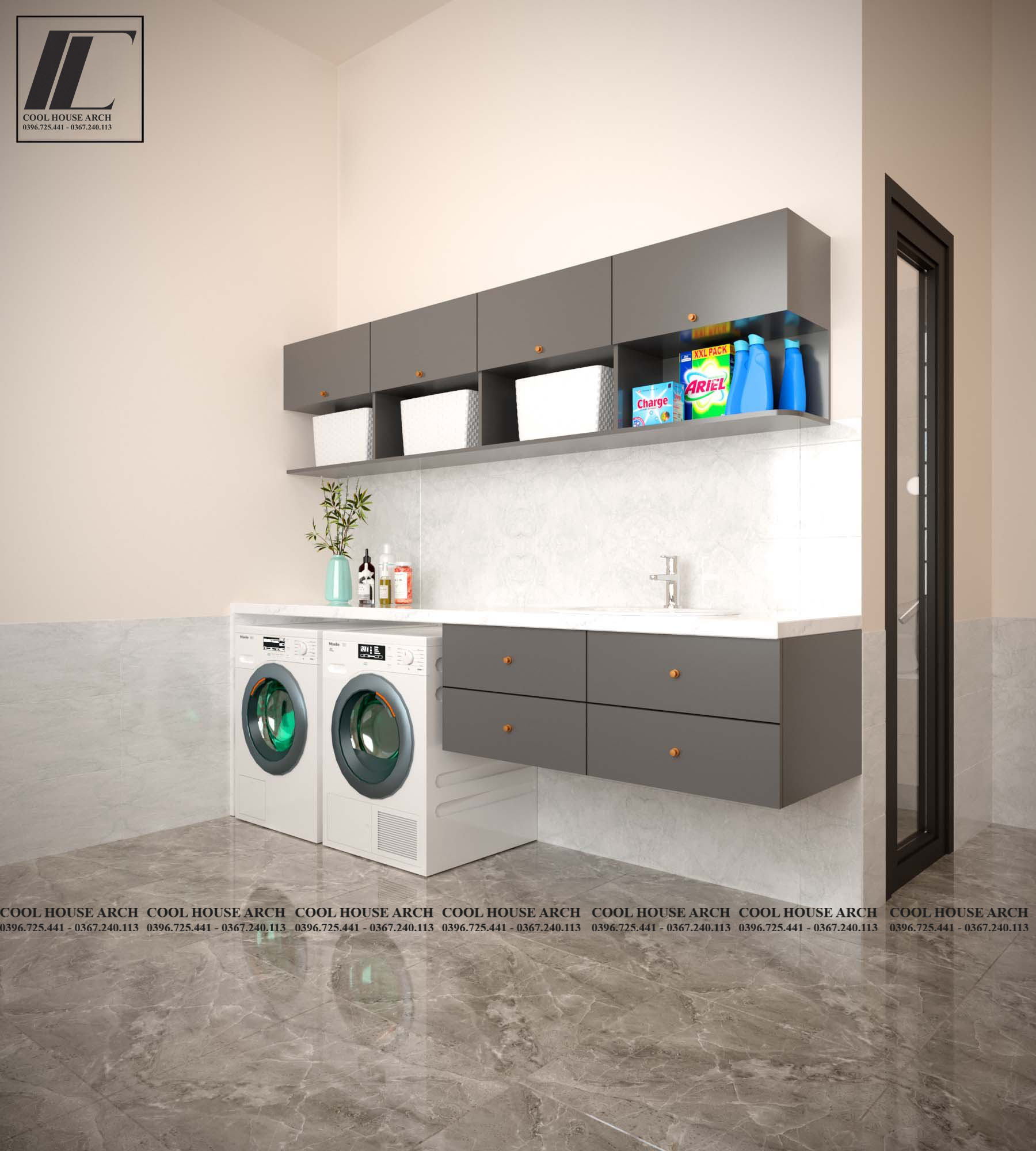 Khu giặt phơi được thiết kế đầy đủ tiện nghi tạo sự gọn gàng.